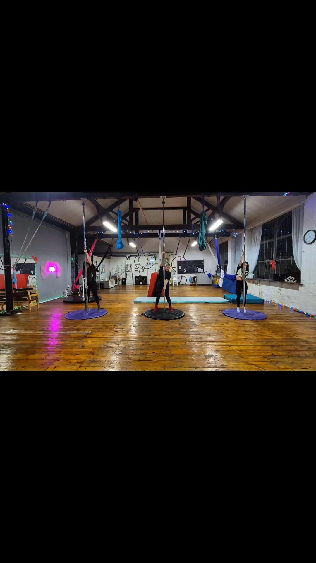 Take a look at our aerial playground students having fun in the aerial slings. Doubles is challenging but great fun. #aerialhammock #aerialsling #polestudio